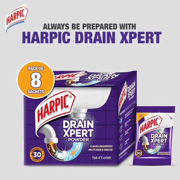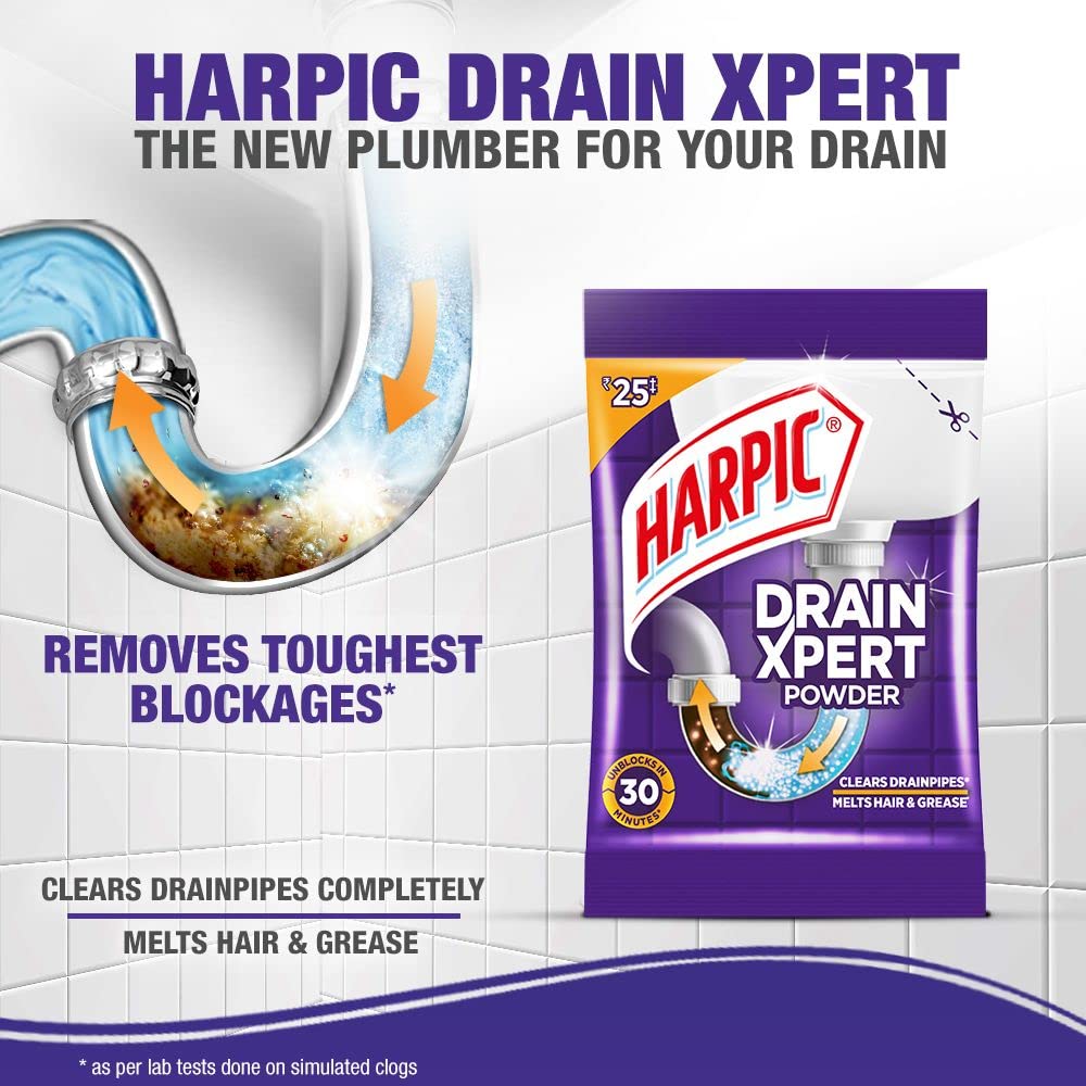 The new plumber for your drains. Harpic Drain Xpert Powder is a drain cleaning powder for use in blocked drains only. It melts grease and hair to unblock the drain pipe completely in 30 minutes. It does not damage the pipes, sinks or septic tanks. Can be used on all types of drains and pipes.